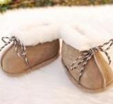 Estas acogedoras botas, mantienen los pies del bebé cálidos, realizadas en lana natural de oveja con un suave acabado exterior en piel natura y suela de cuero suave. Hecho en los EE.UU. Color: tostado. Tallas: S, M