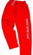 7,75 oz 50/50 pantalones de lana preencogida con letras impresas: “Remove Before Flight. Cintura elástica con cordón. Base abierta pierna ligeramente cónica.